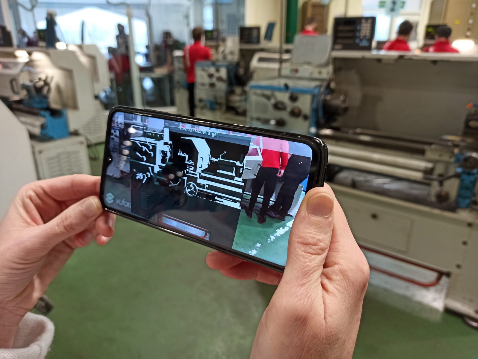 Reconocimiento y seguimiento de un torno Pinacho mediante la tecnología basada en el reconocimiento de modelos (“Model Target based recognition”) para, mediante realidad aumentada, superponiendo el modelo 3D digital de la máquina y usando animaciones y paneles aumentados, guiar las instrucciones de mantenimiento correctivo y preventivo a realizar.
